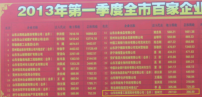 為表彰和宣傳企業誠信納稅,進一步扶持企業做大做強,同時推動兗州經濟升級發展,近期兗州市對2013年第一季度納稅50強企業排行榜進行了公示,山東經典重工集團股份有限公司榮登2013年第一季度兗州納稅五十強企業排行榜第二十六位。