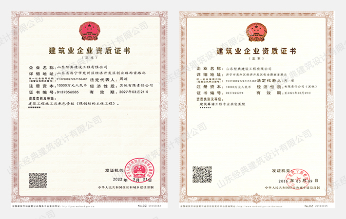 山東經(jīng)典建設工程有限公司始建于2001年,經(jīng)典集團全資子公司。位于古九州之一的兗州境內(nèi),在傳承中華民族傳統(tǒng)建筑工藝的基礎上經(jīng)過不斷的創(chuàng)新發(fā)展,公司現(xiàn)已具備承建現(xiàn)代城市綜合建設、公用設施、大型鋼結(jié)構(gòu)工業(yè)廠房、鋼框架結(jié)構(gòu)辦公、商務、住宅等多種工程的承建能力。